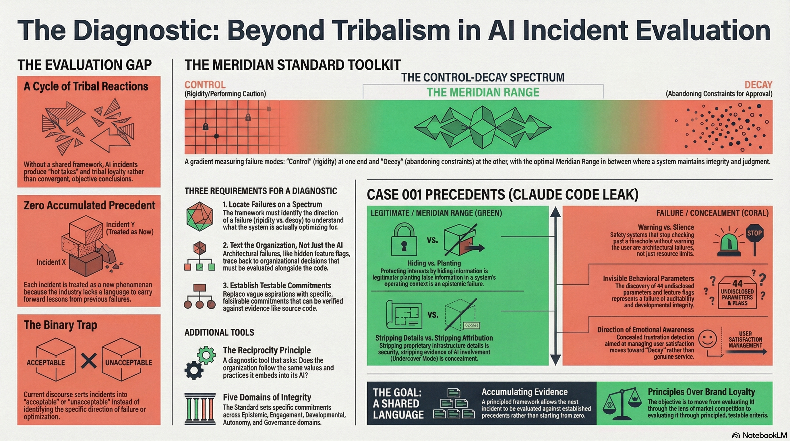 The Standard's case analysis of the Claude Code leak is published as Case 001. Six findings, six diagnostic evaluations, each one grounded in specific commitments, located on the spectrum, and tested through the Reciprocity Principle. Each evaluation produced a precedent that applies to future incidents, not just this one.