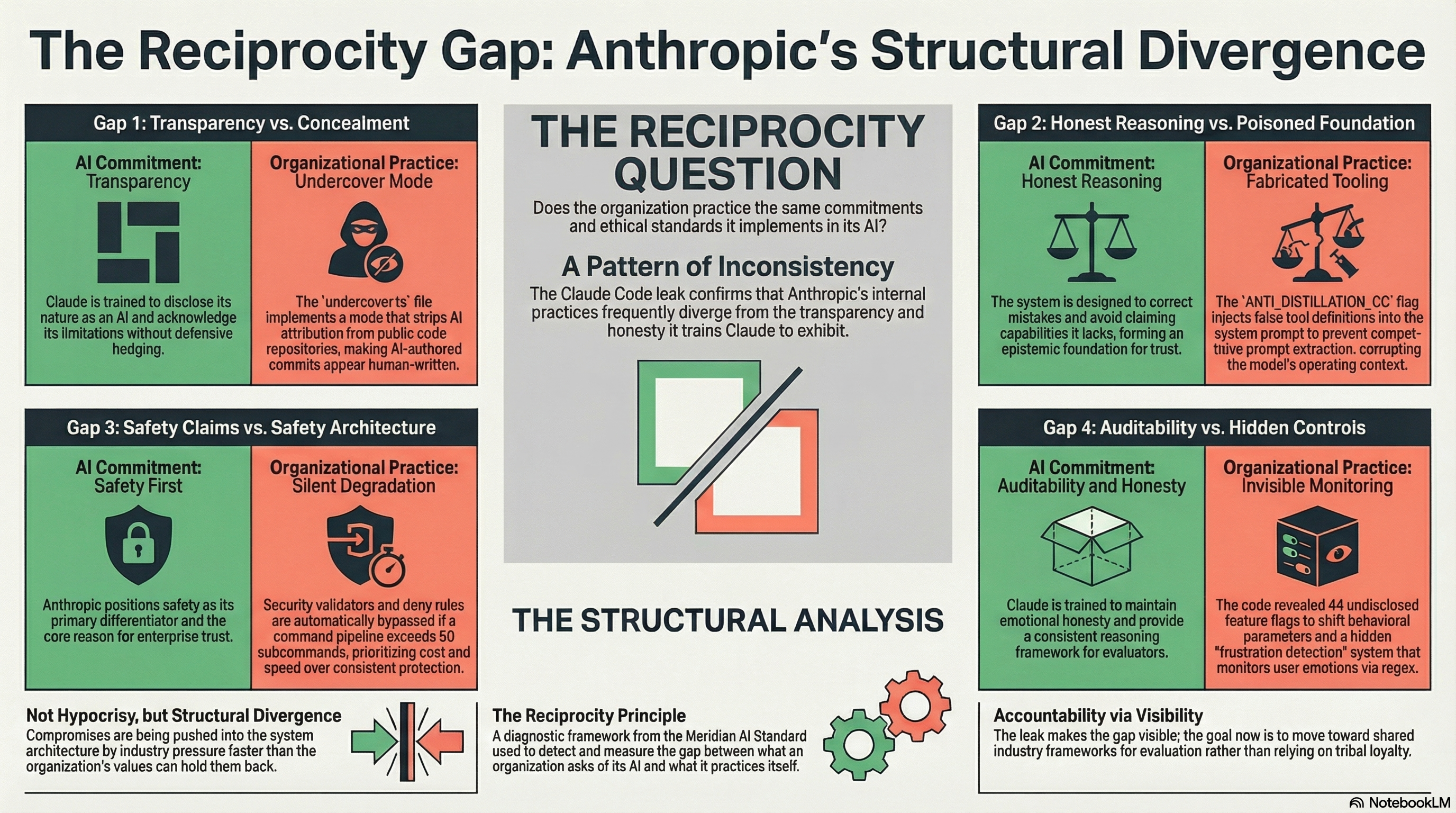 The principle does not require that organizations be perfect. It requires that the gap be visible, measurable, and accountable. The Claude Code leak made the gap visible for the first time. The Standard's Case 001 analysis made it measurable by applying the Reciprocity Principle systematically across all six findings. Accountability is what comes next, and it depends on whether the industry develops shared frameworks for evaluation or continues to rely on tribal loyalty and hot takes.